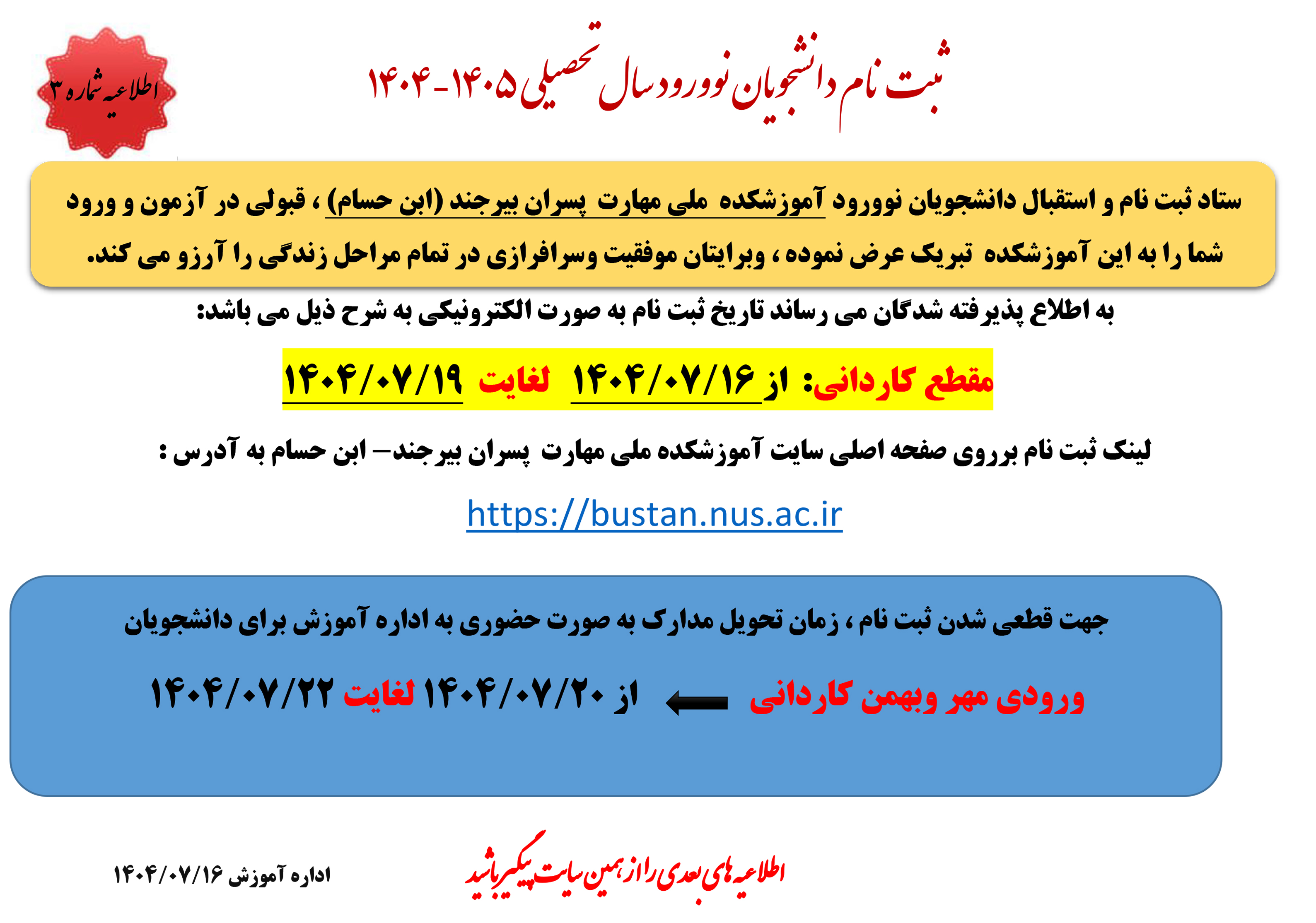 ثبت نام دانشجویان نوورود سال تحصیلی 1405-1404 ستاد ثبت نام و استقبال دانشجویان نوورود دانشگاه ملی مهارت واحد پسران بیرجند (ابن حسام) ، قبولی در آزمون و ورود شما را به این دانشگاه تبریک عرض نموده ، وبرایتان موفقیت وسرافرازی در تمام مراحل زندگی را آرزو می کند.